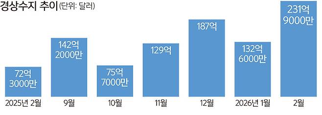 중동 사태의 여파는 4월부터 반영될 수 있다는 관측이 나온다. 유가 상승이 본격적으로 반영되며 경상수지 흑자를 끌어내릴 수 있다는 우려다. 3월까지는 원유 운송 시차와 석유류 제품 수출 증가 등에 힘입어 흑자 흐름을 이어갈 것으로 보인다.