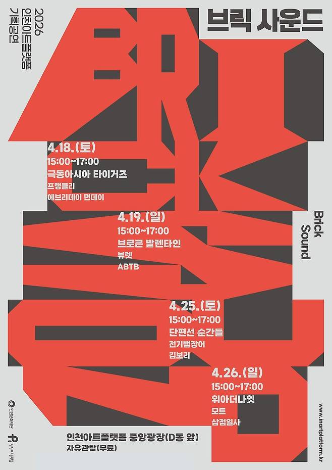 ‘브릭 사운드’는 인천아트플랫폼의 공간적 특성을 살린 야외 공연 프로그램으로, 록과 인디 음악을 중심으로 다양한 장르의 음악을 통해 시민들에게 자유롭고 생동감 있는 문화예술 경험을 제공하고자 기획됐다. 이번 공연은 열린 공간에서 누구나 부담 없이 즐길 수 있도록, 일상 속 문화 향유 기회를 확장하는 데 의미를 둔다.