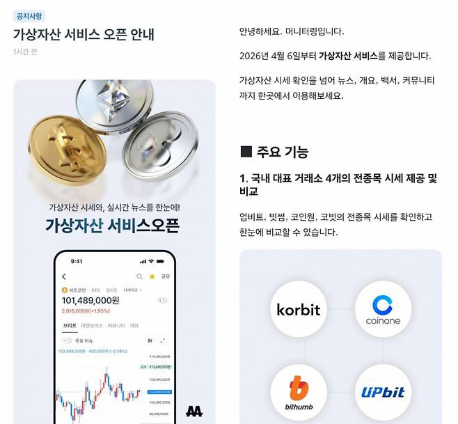 이를 통해 머니터링 이용자들은 △거래소별 시세 통합 비교 △종목 개요 및 백서 확인 △실시간 관련 뉴스 및 커뮤니티 연결 등 심층 정보를 단일 화면에서 원스톱으로 확인할 수 있다. 분산된 정보를 통합 제공함으로써 투자자의 탐색 효율과 편의성을 높였다는 설명이다.