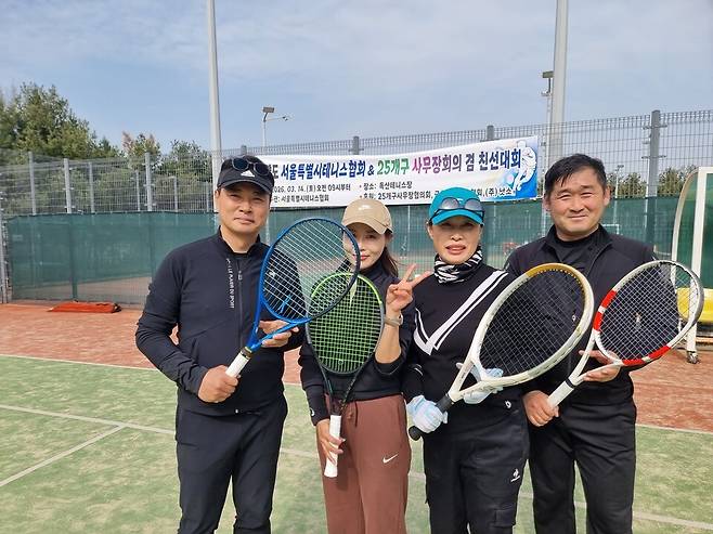 2026년도 서울특별시테니스협회&25개구 사무장 친선대회가 3월 14일 금천 구립코트에서 열렸다. 김은섭 서울시테니스협회 회장과 우성만 금천구테니스협회 회장 그리고 20개구의 사무장(회장 김유환)들이 참석했다.