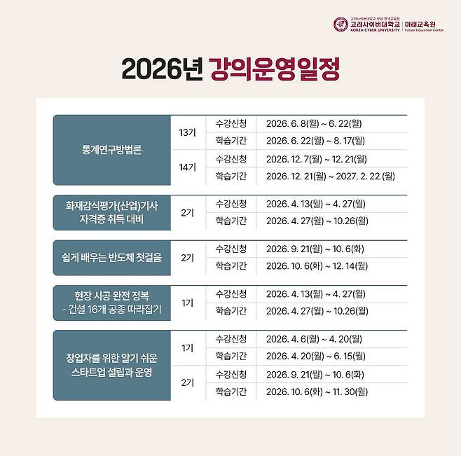 한편, 고려사이버대학교는 2026학년도 2학기 일반대학원과 경영전문대학원 신입생을 오는 5월 중순부터 모집한다. 경영전문대학원은 2026학년도 1학기에 개원하였으며 국내 사이버대학 최초로 석·박사통합과정을 운영하고 있다.