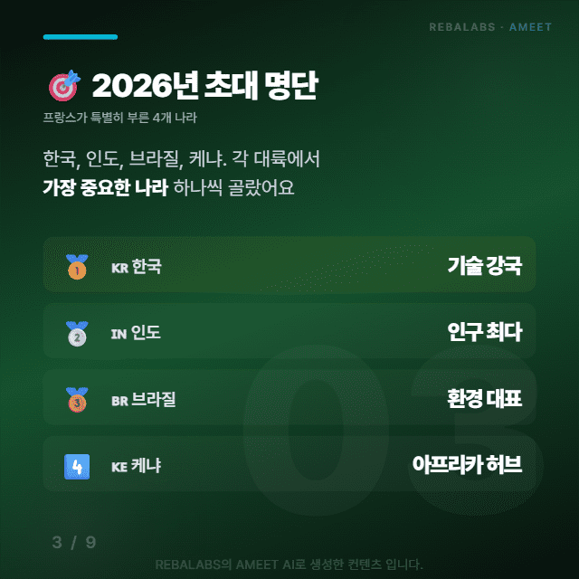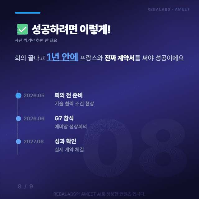 전문가들은 단순히 사진 찍고 끝나면 안 되고, 회의 끝나고 1년 안에 프랑스와 진짜 계약서를 쓰는 게 중요하다고 강조하는데요. 이번 초대장을 실질적인 비즈니스 기회로 만들 수 있을지, AMEET이 계속 지켜보며 전해드릴게요!