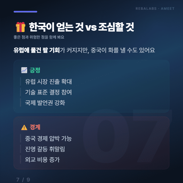 한국에게는 유럽 시장에 물건을 팔 기회가 커지는 좋은 점이 있지만, 중국이 이걸 달갑지 않게 볼 수도 있어요.