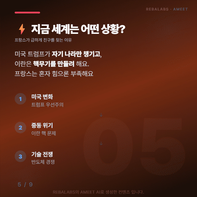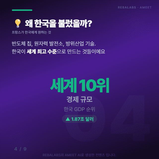 프랑스가 한국을 부른 이유는 명확해요. 반도체 칩, 원자력 발전소, 방위산업 기술처럼 한국이 세계 최고 수준으로 만드는 것들이 필요하기 때문이에요. 지금 세계 상황이 급박하거든요.