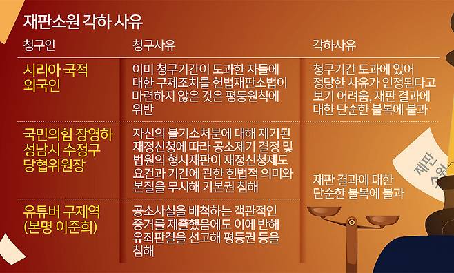 이재명 대통령에 대한 허위사실 공표로 유죄가 확정된 장영하 국민의힘 성남시 수정구 당협위원장, 유튜버 쯔양에게 수천만원을 뜯어내 실형이 확정된 유튜버 구제역(본명 이준희)이 낸 재판소원 사건도 “청구 사유에 해당하지 않는다”는 이유로 이번에 각하됐다.