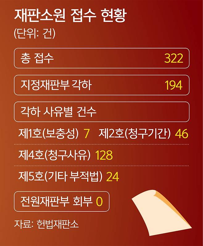 헌재는 사건이 접수되면 지정재판부에서 법적 요건을 갖췄는지 판단하고 청구가 부적법하면 본안 심리 없이 각하하는데, 아직 단 한 건도 이 ‘첫 관문’을 통과하지 못한 셈이다.