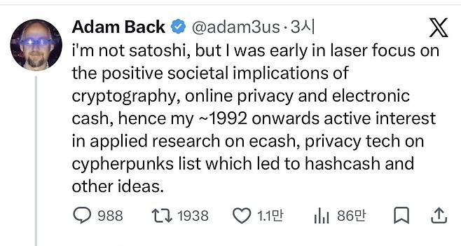 올해 55세의 영국인 암호학자 애덤 백, 본인은 부인
