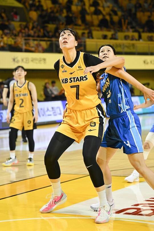 우리은행 수비수가 강하게 밀어도, 박지수는 텐션을 낮추지 않았다. 파울 자유투를 얻었다. 박지수의 그런 전투력이 KB와 우리은행의 텐션 차이를 부각시켰다.