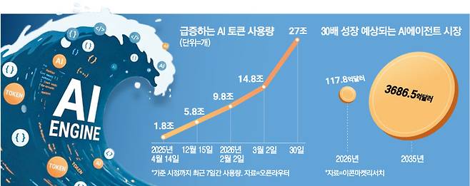 7일(현지시간) 정보기술(IT) 전문매체 더 인포메이션에 따르면 마이크로소프트(MS)가 운영하는 ‘깃허브’의 연간 코드 커밋(코드를 추가하거나 저장하는 횟수) 수는 올해 140억건으로 1년 전보다 14배 가까이 증가할 것으로 전망된다. 주간 커밋 수도 현재 2억7500만건에 달하면서 올해 들어 매주 최고치를 경신하고 있다. AI 에이전트가 코드 생성과 수정 작업을 자동으로 수행하면서 인간의 작업 속도를 넘어서는 생산 구조가 형성된 결과다. 이는 자연스럽게 토큰 사용량 증가로 연결된다. 오픈라우터에 따르면 주간 토큰 사용량 수는 지난해 4월 1조7800만개에서 올해 3월 말 현재 27조개로 15배나 증가했다.