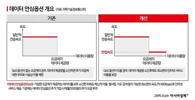 먼저, 통신3사의 모든 LTE·5G 데이터 요금제에는 별도의 추가 요금 없이 데이터 안심옵션(QoS)이 포함된다. 요금제별 제공되는 데이터를 모두 소진한 뒤에도 약 400kbps의 속도로 데이터를 무제한으로 이용할 수 있는 옵션이다. 400kbps는 기본적인 메신저 이용이나 웹서핑, 지도 검색 등이 가능한 수준의 속도다. 기존에는 QoS 미적용 요금제 이용자는 매월 5500원 수준의 추가 요금을 낸 뒤 이용할 수 있었다. QoS 없이는 기본 제공 데이터 소진 시 데이터 이용이 차단되거나 사용량에 따른 추가 요금이 부과됐다.