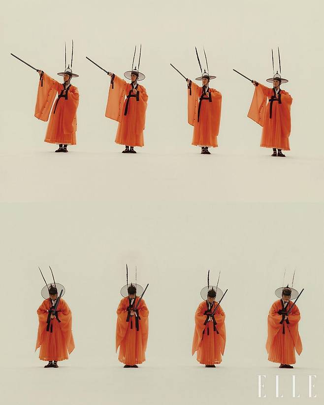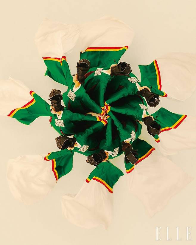 전통을 벗어나기 위한 시도라기보다 전통 구조를 존중하면서 그 안에서 오늘의 감각으로 확장한 과정. 무대의 히로인인 최태헌 서울시무용단 단원은 제목 그대로 ‘집단’ 군무의 조화가 같이 이뤄져야 하는 이번 안무의 ‘수행’ 과정에 대해 털어놓았다. “무용수마다 신체 조건이 다르기 때문에 움직임의 크기나 소품을 사용하는 각도까지 앞과 옆의 무용수에게 최대한 맞추는 데 신경 썼습니다. 그 과정이 쉽지는 않았고, 작은 차이까지 계속 보여 꽤 힘들었지만 수많은 반복 연습을 통해 서로의 타이밍과 호흡을 맞춰가면서, 숨소리까지 맞는다고 느낄 정도로 호흡이 깊어졌어요.”