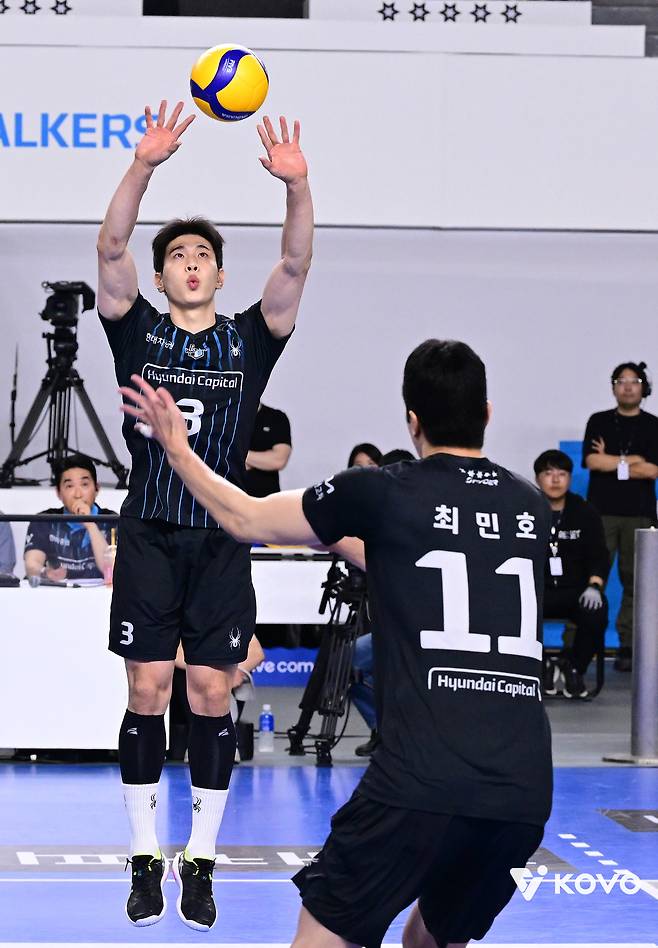 4차전엔 달랐다. 1세트 처음부터 3세트 마지막까지 오롯이 황승빈이 팀의 공격 조율을 도맡았다. 그만큼 황승빈의 토스워크나 공격 배분이 흠잡을 데 없었다는 얘기다. 특히 3세트 듀스 상황에서 허수봉에게 올려준 퀵오픈 토스 2개는 그야말로 완벽했다. 최대한 잡아서 상대 블로킹을 교란시키고, 빠르고 정확한 토스로 허수봉의 완벽한 공격을 이끌어냈다. 흔들리던 황승빈의 컨디션이 돌아온 만큼 현대캐피탈의 ‘리버스 스윕’ 가능성은 더 높아졌다.