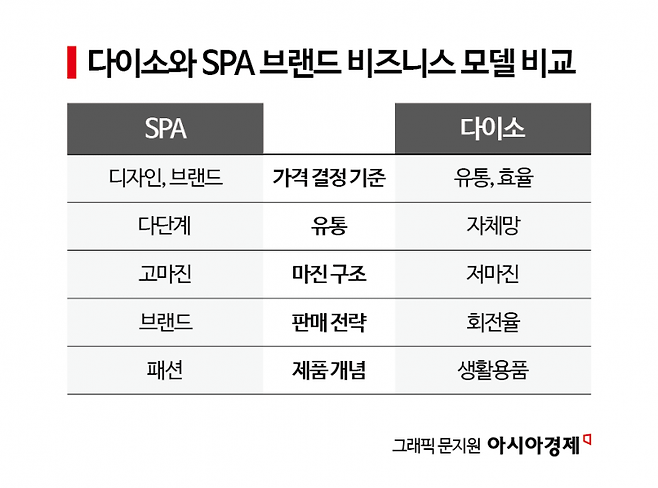 상품 운영 방식에서도 차이가 나타난다. SPA 브랜드는 다양한 디자인과 색상, 사이즈를 운영하는 반면 다이소는 품목 수(SKU)를 제한해 동일 상품을 대량 생산한다. 마진율은 낮지만 회전율로 이를 보완하는 전형적인 '박리다매' 모델이다. 개별 상품이 아닌 전체 상품군 단위로 수익을 관리하는 구조도 특징이다. 특정 제품의 마진이 낮더라도 다른 상품군에서 이를 보완하는 것이다.