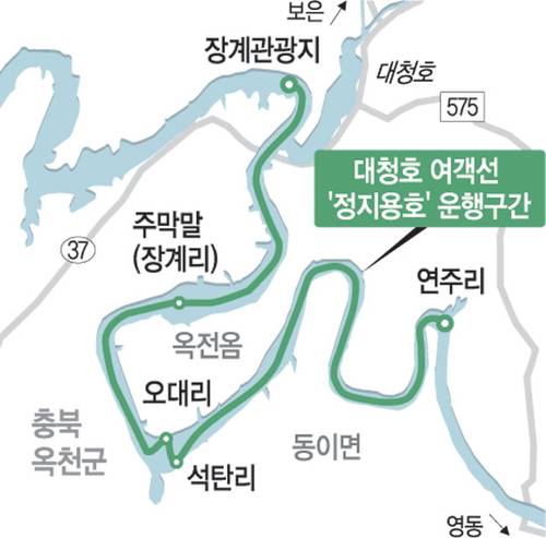 옥천군은 그동안 줄기차게 뱃길 복원을 요구했다. 관광객 유치의 기대가 있었겠지만, 앞세웠던 건 호수에 둘러싸여 ‘육지 속의 섬’이 된 마을 주민들의 이동권 확보였다. 부정기적으로 운항하는 마을 배 말고, 정기 여객선을 투입하자는 게 옥천군의 주장이었다.