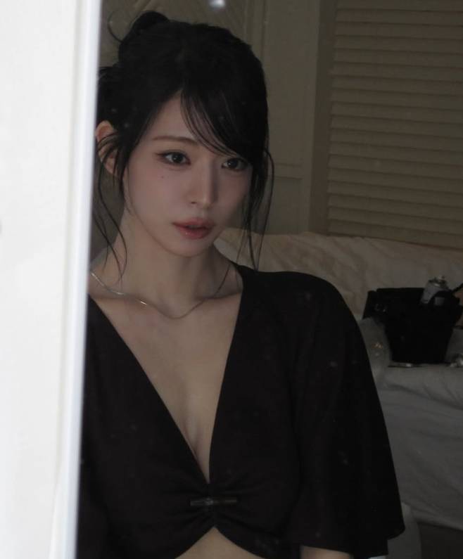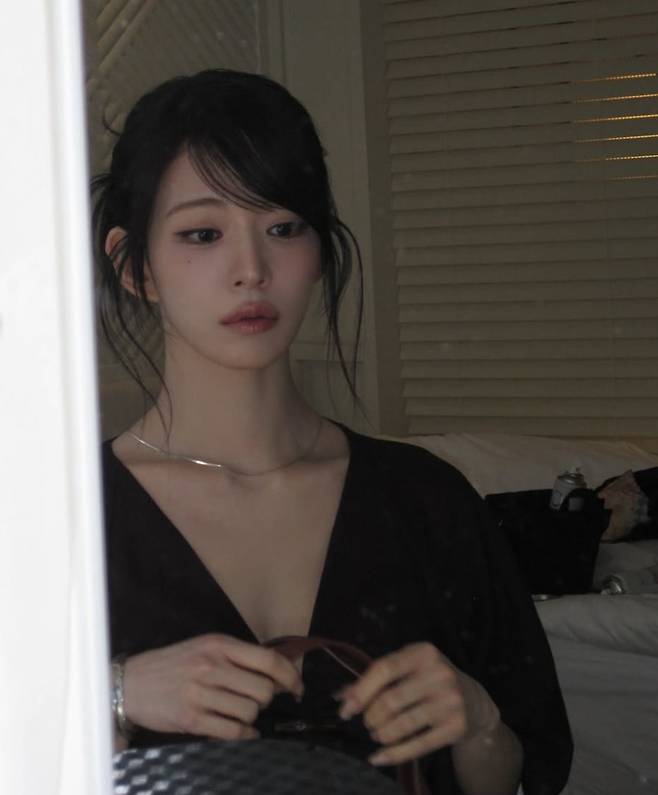 또 다른 사진에서는 거울을 사이에 두고 포착된 모습이 담겼다. 차분한 조명 아래 차분한 표정으로 가방을 들고 있는 장면은 마치 영화 속 한 장면 같은 분위기를 연출했다.