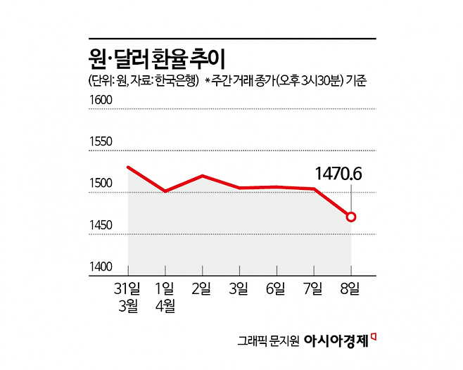 여기에는 지난달 19일 이후 줄곧 1500원 전후에서 고공행진을 하던 환율이 전날 이란 전쟁 2주간 휴전 소식에 33.6원 급락하며 단숨에 한 달 전 레벨(1470원 선)로 회복한 영향이 컸다.
