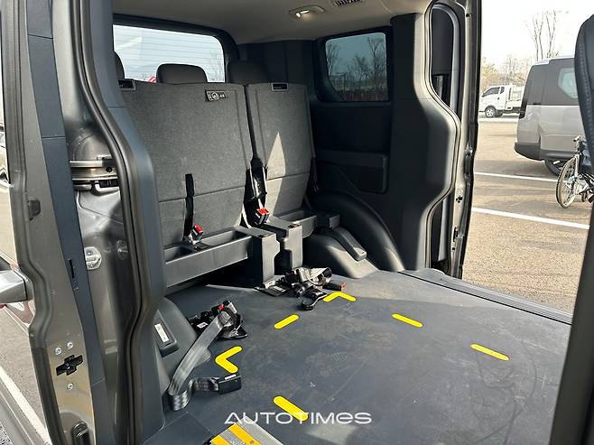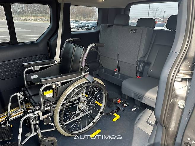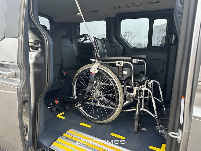 실내는 기능 중심이다. 2열에는 6:4 팁업 시트를 적용해 우측을 접으면 휠체어 공간이 확보되고 좌측에는 동승자가 앉을 수 있다. 시트 위치도 패신저보다 뒤로 배치돼 휠체어 진입과 회전 동선을 고려했다. 실제로 실내에서 방향 전환이 가능할 정도의 공간이 확보된다.