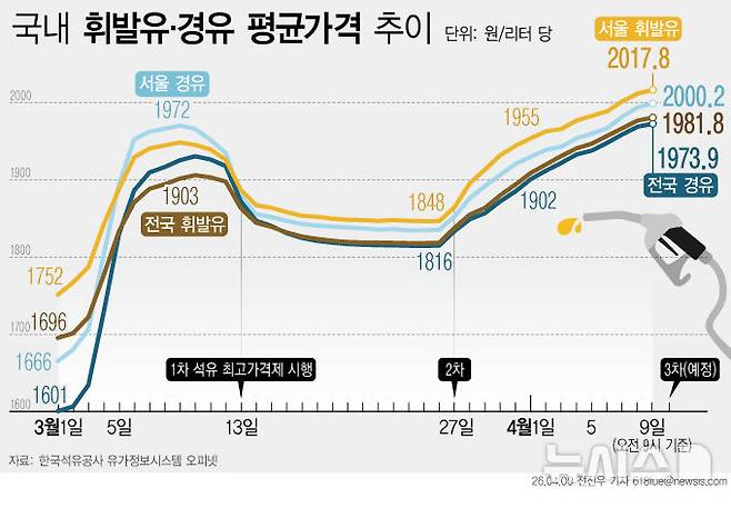 [서울=뉴시스] 9일 한국석유공사 유가정보사이트 오피넷에 따르면 이날 오전 9시 기준 서울 평균 경윳값은 전날보다 5.5원 오른 2000.2원을 기록했다. 중동 사태 여파로 서울 평균 휘발윳값이 리터(ℓ)당 2000원대를 넘어선 데 이어 경윳값도 2000원대에 진입했다. 서울 평균 경윳값이 2000원대를 기록한 것은 중동 사태 장기화에 따른 정부의 석유제품 최고가격제 시행 이후 처음이다. (그래픽=전진우 기자)