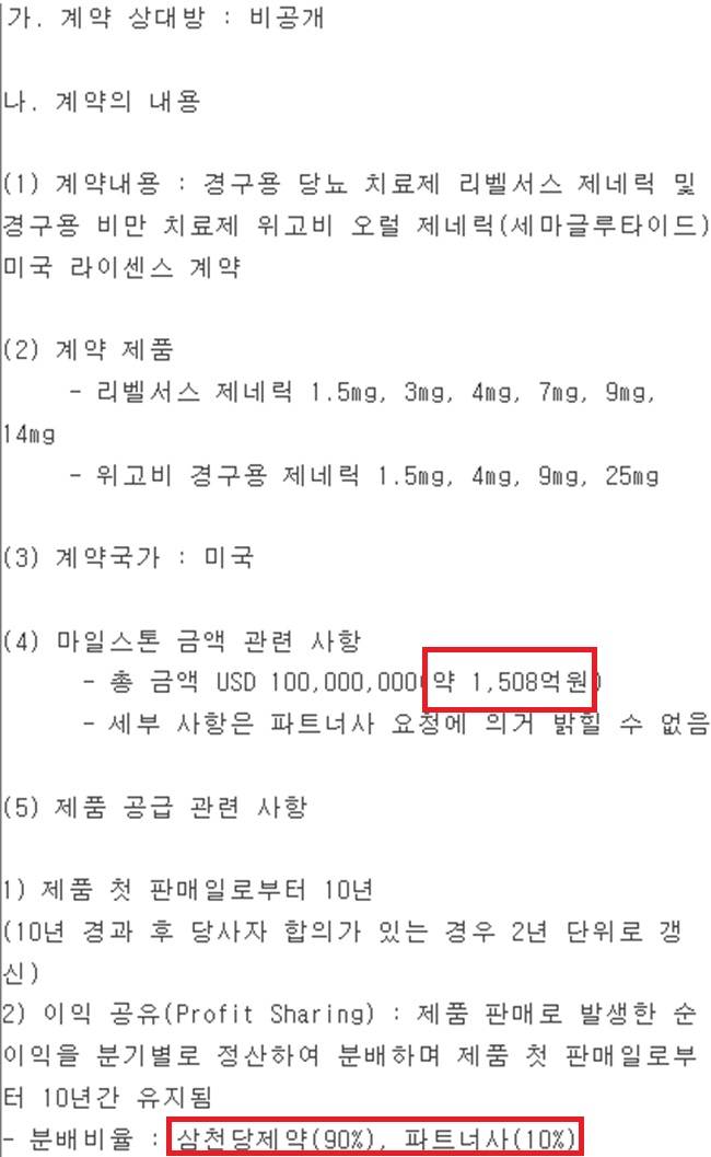 삼천당제약은 기술수출 목적의 회사가 아니라 제품공급 회사이므로 파트너사로부터 받기로 한 개발마일스톤은 적지만 판매개시 이후 이익을 많이 가져갈 수 있다는 게 전 대표의 설명입니다. 공시된 '마일스톤 1500억원'은 이번 계약의 가치를 온전히 평가하기 어렵다고 주장합니다. 판매수익을 미국 파트너와 9(삼천당제약) 대 1로 분배하기로 했다고 말하기도 했습니다.