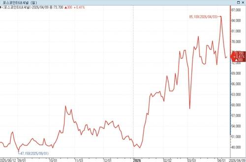 올해 들어 전 거래일까지 포스코인터의 주가는 48% 상승했다. 컨센서스 제출 증권사들의 평균 목표 주가는 9만3천원대로 현재 대비 26%가량 높다.