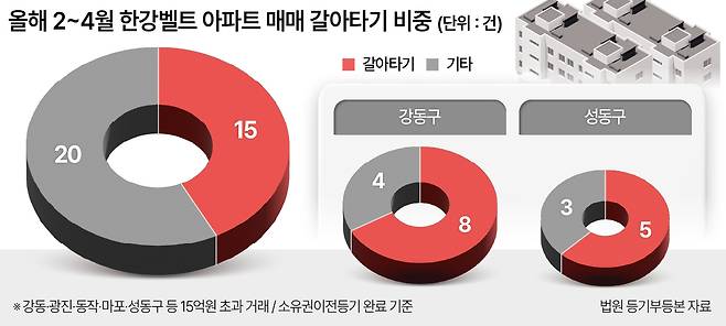 9일 헤럴드경제가 올해 2~4월 한강벨트 5개 자치구(강동·광진·동작·마포·성동구)의 15억원 초과 아파트 매매 중 소유권이전등기가 완료된 거래의 등기부등본을 전수조사한 결과, 35건 중 15건(43%)이 기존 주택을 처분하고 매수한 갈아타기인 것으로 확인됐다.