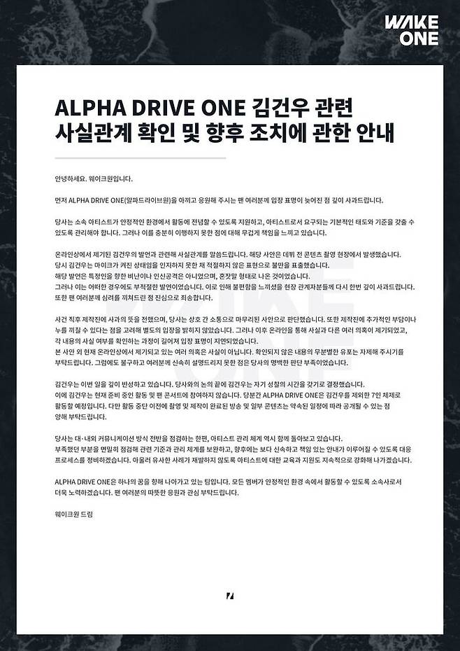 보이그룹 알파드라이브원 멤버 김건우를 둘러싼 이른바 'FD 갑질 의혹'에 대해 소속사 웨이크원이 공식 입장을 내고 해명했다.