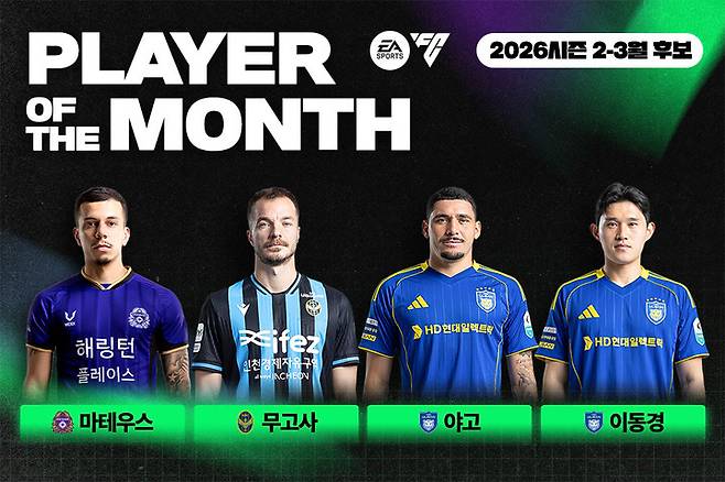 한국프로축구연맹은 9일 2026시즌 2-3월 'EA SPORTS 이달의선수상(EA SPORTS Player Of The Month)'의 주인공을 선정하는 팬 투표가 오늘부터 12일까지 4일간 진행된다고 밝혔다.