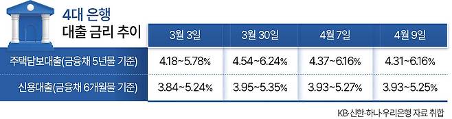 지난 달 3일 4대 은행의 주담대 금리는 연 4.18%~5.78%였는데, 3월 30일에는 4.54%~6.24%로 상단 금리가 6%를 넘겼다. 이 기간 준거금리인 은행채 5년물 금리는 연 3.721%에서 4.079%로 급등했다.