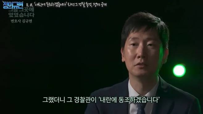 | ▲ 김규현 변호사가 지난해 11월 3일 자신의 유튜브 채널을 통해 김완기 전 서울경찰청 8기동단장이 12.3 내란 당시 국회 앞에서 "내란에 동조하겠습니다"라고 발언한 것을 목격했다고 폭로했다. |