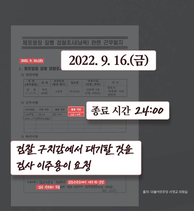 2022년 9월 16일 남 변호사는 자정까지 조사를 받았지만 서울구치소로 돌아가지 못했고, '검사가 구치감 대기를 요청했다'고 돼 있습니다.