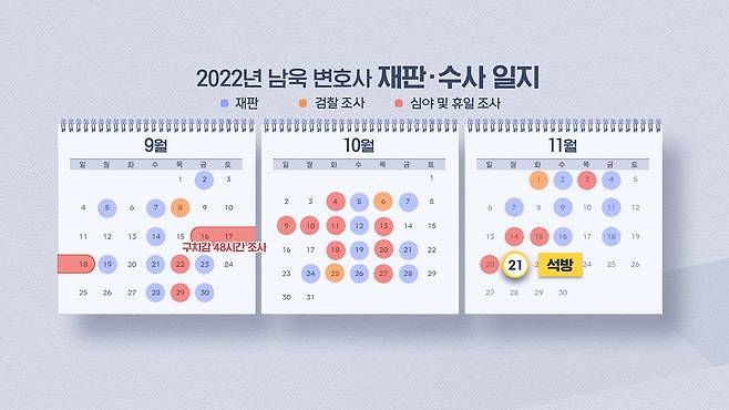 2022년 9월 18일 이후부터 11월 21일 0시 구속기한 만료로 남 변호사가 석방될 때까지 두 달여간 남 변호사의 서울구치소 출정기록을 달력으로 정리했습니다.