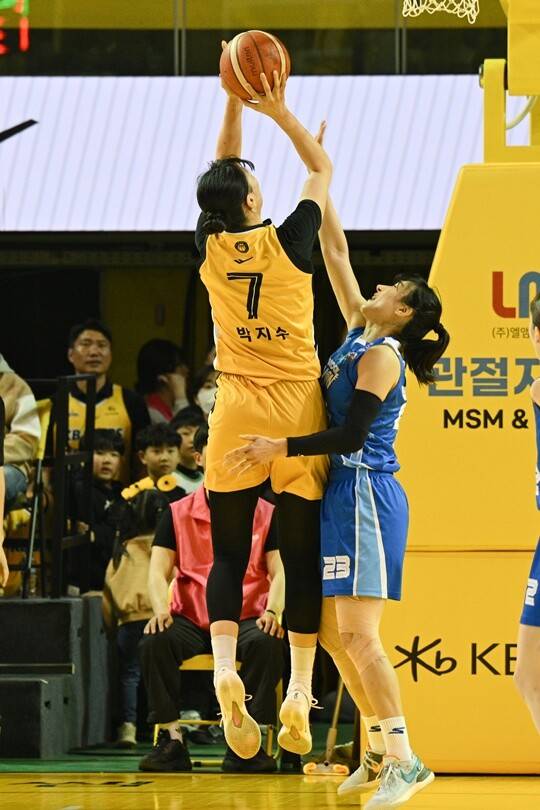 김단비가 나섰다. 김단비는 확실히 노련했다. 상황에 맞게 수비 위치를 선점했다. 다만, 김단비도 박지수의 순간적인 동작을 막지 못했다. KB 다른 선수들의 플레이를 체크해야 했기에, 박지수에게만 집중할 수 없었기 때문이다.