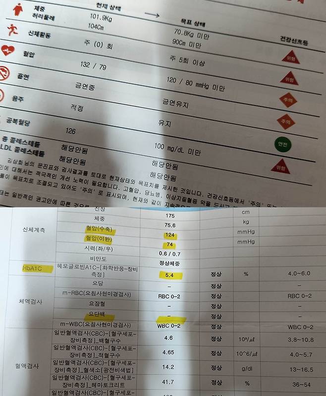 | ▲ 2023년 11월 건강검진 기록표(맨 위), 2025년 보건소 측정 건강검진 기록표(아래) 체중 및 혈당 관련 수치가 상당부분 개선되었다. |