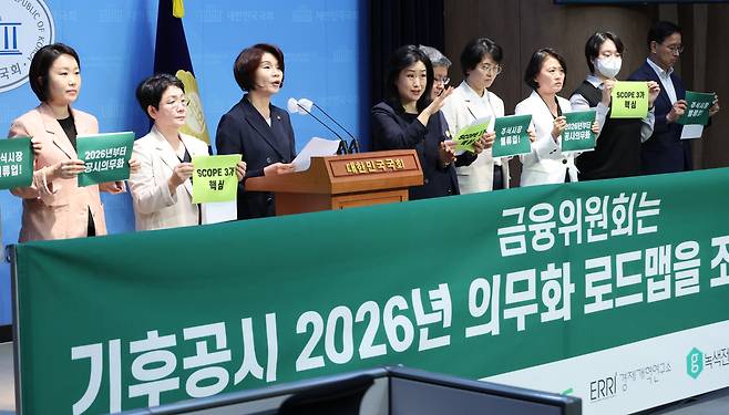 | ▲ 더불어민주당 기후행동의원모임 '비상'과 시민단체 회원들이 2024년 9월 23일 서울 여의도 국회 소통관에서 '2026년 기후 공시 의무화 로드맵' 시행을 촉구하는 기자회견을 하고 있다. |