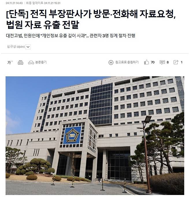 사건이 불거지자 대전고법은 이씨에게 "개인정보 유출 사실이 있었음을 알려드린다"라며 "심려를 끼쳐 드리게 되어 깊이 사과드린다"고 고개를 숙였습니다. 자료 유출 2년 만에 나온 뒤늦은 시인이었습니다.