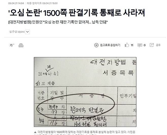 "재판 기록 1500여 쪽(사건조서, 증거목록, 이 씨가 제출한 참고자료)이 존재하지 않습니다."