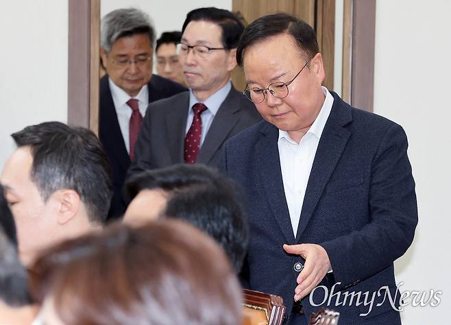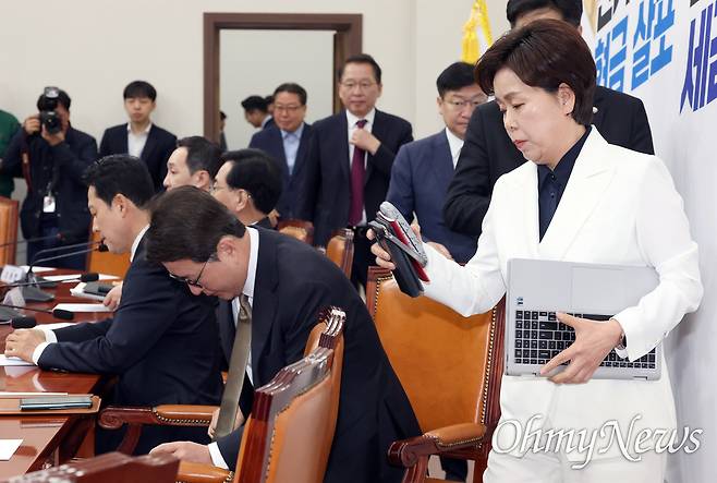 김 최고위원의 발언을 듣던 송언석 원내대표와 신동욱 최고위원은 곧바로 자리에서 일어나 회의장을 나갔다. 송 원내대표 측은 '이석 이유'를 묻는 <오마이뉴스>에 "발언이 부적절하잖나"라며 "(송 원내대표가) 기분이 나빠서 이석한 게 맞는다"라고 설명했다. 다만 신 최고위원은 국조특위 현장 점검 일정 때문에 자리를 뜬 것으로 전해졌다.