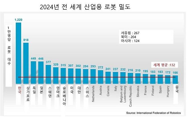 지역별로는 서유럽이 로봇 밀도 267대로 가장 높았고 이어 북미(204대)와 아시아(131대) 차례였다. 2024년 세계 평균 로봇 밀도는 132대였다.