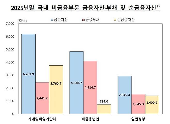 9일 한국은행이 발표한 ‘2025년 자금순환통계’를 보면, 지난해 말 기준 국내 가계(개인사업자 포함)의 총 금융자산 잔액은 총 6201조9240억원이다. 2024년 말(5468조8570억원)에 견줘 733조원 증가했다. 가계 금융자산 구성은 현금·예금 2676조4560억원, 보험·연금 준비금 1650조3090억원, 채권 182조140억원, 지분증권·투자펀드 1644조3380억원으로 나타났다.