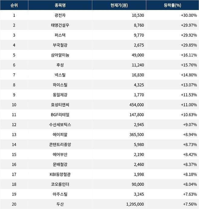 이 밖에도 BGF리테일(282330) 10.63%, 수산세보틱스(017550) 9.07%, 에이피알(278470) 8.94%, 콘텐트리중앙(036420) 8.73%, 에어부산(298690) 8.42%, 문배철강(008420) 8.37%, KBI동양철관(008970) 8.18%, 코오롱인더(120110) 8.04%, 아주스틸(139990) 7.63%, 두산(000150) 7.56% 등을 기록하며 이날 증시를 상승으로 마감했다.