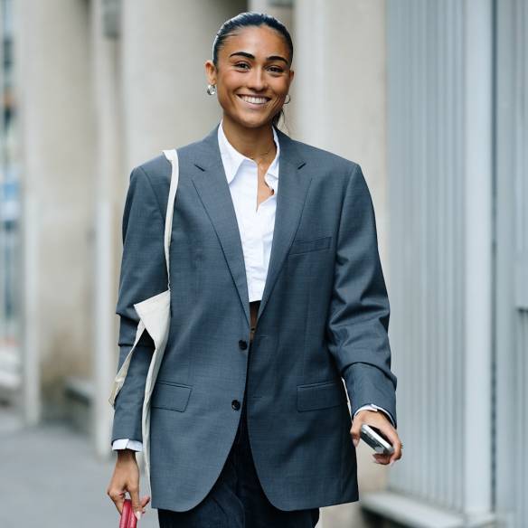 정장으로 입기 딱 좋은 회색 자켓. 클래식하게 입으면 출근룩으로도 완벽하고 하객룩으로도 완벽하죠. 회색 자켓에는 청바지도 어울리고, 회색 바지 셋업으로도 예쁜데요. 그렇게 입게 되면 봄이지만 봄 느낌이 안 난다거나 좀 심심한 느낌이 들 수도 있어요. 그럴 땐 이 룩처럼 컬러풀한 가방을 들어보세요. 빨간색, 노란색 등 원색의 아이템을 하나 들면 해외 스트릿 패션 남부럽지 않은 룩을 완성할 수 있답니다. 가방이 없다면 색감이 있는 신발도 좋겠네요. 회색 자켓에 빨간색 뾰족구두를 신는 것, 상상만으로도 너무 쿨하지 않나요?