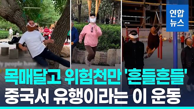 목 부위 통증을 완화하는 방법이라며 철봉이나 나무에 고정한 줄에 목을 걸어 의지한 해 움직이는 일명 '목매달기 운동'이 중국 젊은 층 사이에 확산하고 있습니다.