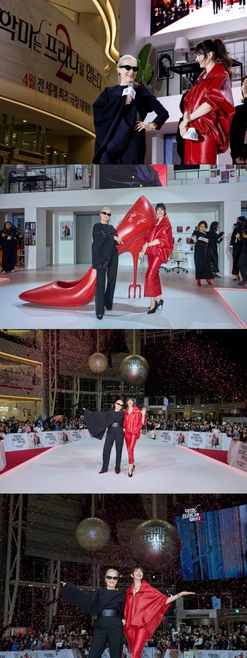 뜨거운 분위기 속 메릴 스트립과 앤 해서웨이의 등장에 한국 팬들은 열띤 환영과 함성을 쏟아냈고, 두 배우는 이에 화답하듯 음악에 맞춰 춤을 추며 현장의 텐션을 최고조로 끌어올렸다. 메릴 스트립과 앤 해서웨이는 꿀 떨어지는 눈빛과 유쾌한 태도로 현장을 찾아준 한국 팬들 한 명 한 명과 소통하는 시간을 가지며 레전드다운 팬서비스로 모두를 사로잡았다.