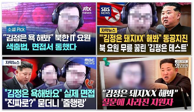 | ▲ 이른바 '북한 IT 요원 색출' 영상을 보도한 언론 유튜브 영상. 왼쪽 위부터 JTBC, SBS, MBC, TV조선. 이 가운데 TV조선을 제외한 나머지 세 방송은 오마이뉴스에서 자체 모자이크 처리함. |