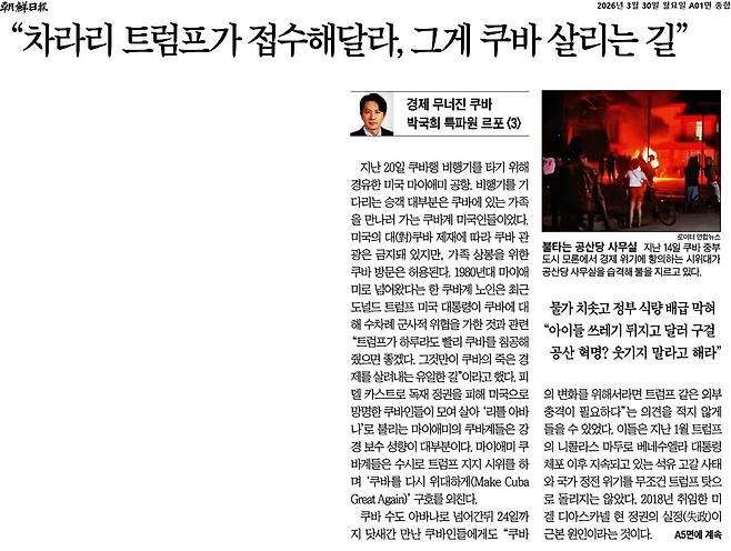 | ▲ 바에사 대사는 지난달 30일 <조선일보>가 지면 1면에 실은 기사 제목인 "차라리 트럼프가 접수해달라, 그게 쿠바 살리는 길"을 콕 집어 비판하기도 했다. 그는 "많은 쿠바 국민에게 국가 존엄에 대한 모욕으로 받아들여질 수 있다"며 "이는 해당 기자가 인터뷰한 일부가 아닌 '쿠바 국민' 전체를 지칭하는 것으로 보일 수 있기 때문"이라고 지적했다. |