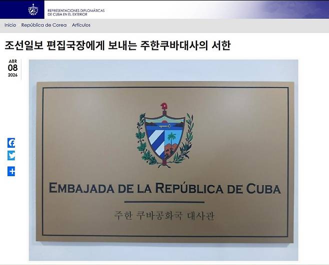 8일 주한쿠바대사관은 누리집과 SNS를 통해 지난 3월 31일 <조선일보>에 전한 서한을 공개했다. 클라우디오 몬손 바에사 주한 쿠바 대사의 명의로 강경희 <조선일보> 편집국장에게 보내는 해당 서한은 지난 3월 27일부터 31일까지 박국희 <조선일보> 워싱턴 특파원이 보도한 쿠바 관련 기사 5건을 문제 삼았다.