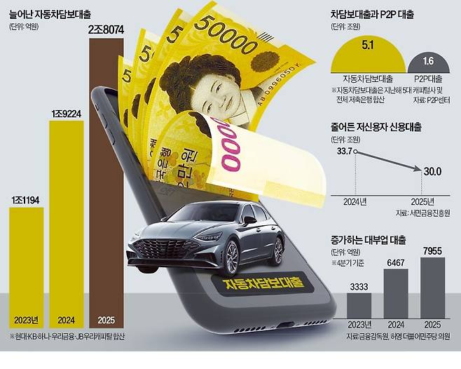 자동차가 있으면 차담보대출이라도 받을 수 있지만, 담보가 없는 취약 차주는 대부업체나 불법 사금융으로 밀려날 가능성이 크다. 금융감독원이 허영 더불어민주당 의원에게 제출한 자료에 따르면 상위 대부업체 30곳의 지난해 4분기 신규 대출 금액은 7955억원으로 2022년 2분기 이후 가장 많았다. 신규 이용자도 8만7227명으로 크게 늘었다. 등록 대부업체 문턱조차 넘지 못한 취약 차주들은 생계자금을 구하기 위해 불법 사금융으로 향할 수 있다.