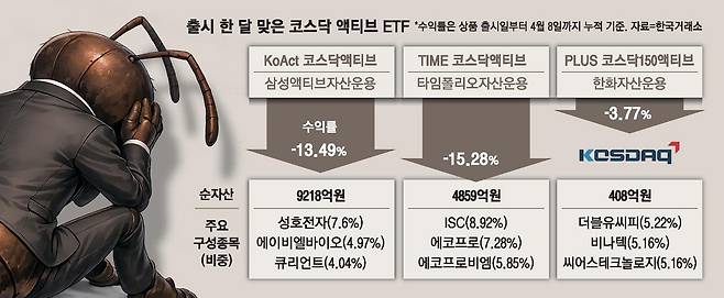 기대감을 안고 출발한 코스닥액티브 상장지수펀드(ETF)가 상장 후 한 달 만에 쓰라린 성적표를 받아들였다. 중동 전쟁의 여파로 외국인의 매도세가 국내 주가 하락을 부추긴 데다가 삼천당제약 등 개별 종목 리스크까지 겹치며 호된 신고식을 치렀다는 평가다.