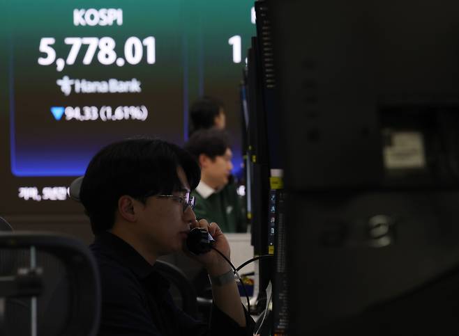 | ▲ 9일 중구 하나은행 본점 딜링룸 전광판에 코스피 종가가 표시돼 있다. 이날 코스피는 전 거래일보다 94.33p(1.61%) 내린 5,778.01에 장을 마쳤다. 원/달러 환율은 11.9원 오른 1,482.5원을 기록했다. 2026.4.9 |