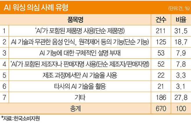 AI 기능의 작동 조건·한계 등의 제한 사항을 명시하지 않아 소비자가 인식하기 어려운 경우(1건)도 있었다. AI가 세탁물 옷감의 재질을 판단해 최적화된 세탁 방식을 적용한다는 ‘AI 세탁모드’ 기능이 실제로는 세탁량 3kg 이하에서만 동작함에도 이를 알리지 않은 사례였다. 공정위의 지적에 업체들은 AI 표현을 삭제하거나, ‘사용환경 및 제품에 따라 동작 조건은 차이가 있을 수 있다’는 식으로 제한 사항을 명기, 시정 조치했다.